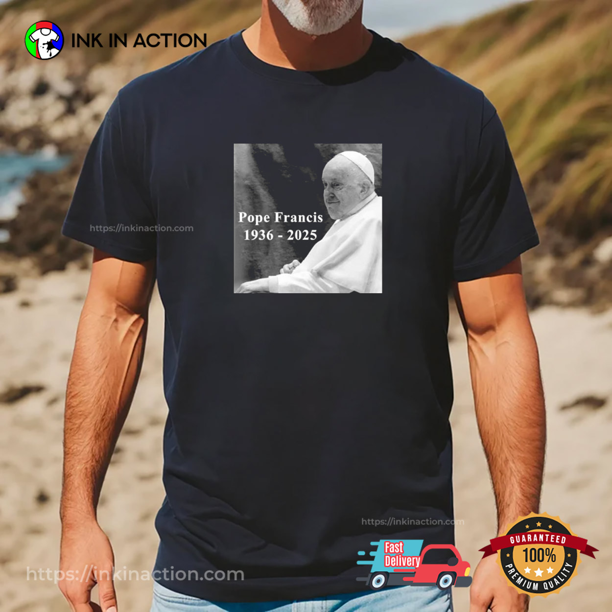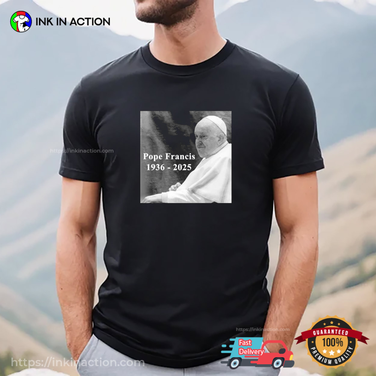 This RIP Pope Francis 1936-2025 Basic T-shirt is categorized as tags: Catholic Church, Pope Francis 1936-2025, Rip Pope Francis, Thank You Father, Vatican City State.