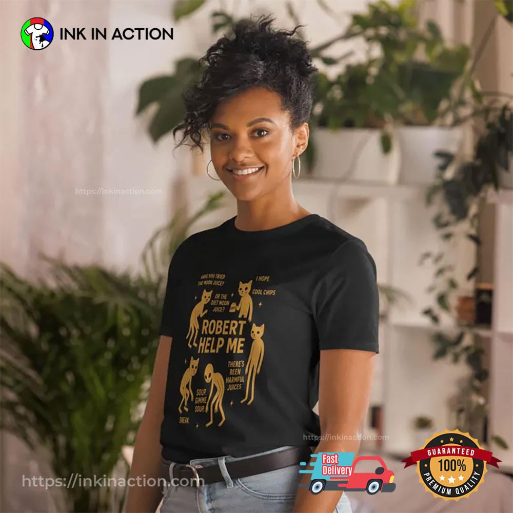 Our team prints each Robert Help Me Funny Cat Meme Shirt carefully. Our shirts are always soft and durable since we print with high-quality, water-based inks and employ traditional hand-screen printing procedures.