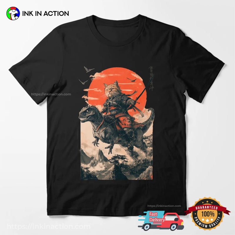 Our team prints each Samurai Cat Riding A Dinosaur Sunset Japanese Style T-shirt carefully. Our shirts are always soft and durable since we print with high-quality, water-based inks and employ traditional hand-screen printing procedures.