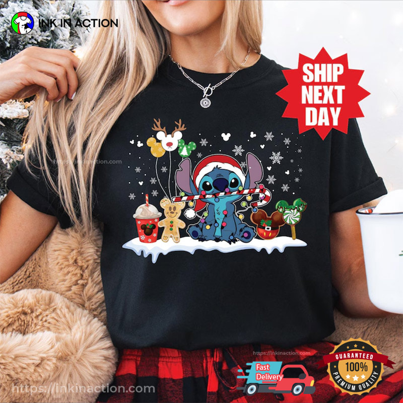 Welcome to InkInAction.com, where the magic of Christmas meets the enchantment of Disney. Our Santa Stitch And Snack Funny Christmas Tees is designed to infuse your festive season with joy and warmth. Proudly printed in the USA, these T-shirts are not just garments; they’re expressions of holiday cheer, family togetherness, and the beloved characters that have warmed our hearts for generations.