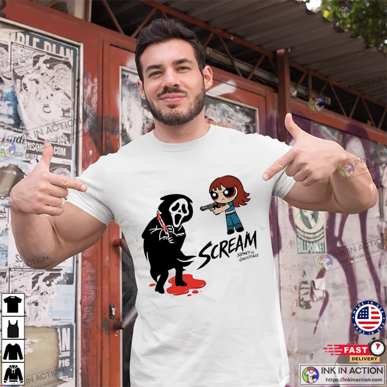Our team prints each Scream Sidney Vs. Ghostface T-shirt carefully. Our shirts are always soft and durable since we print with high-quality, water-based inks and employ traditional hand-screen printing procedures.
