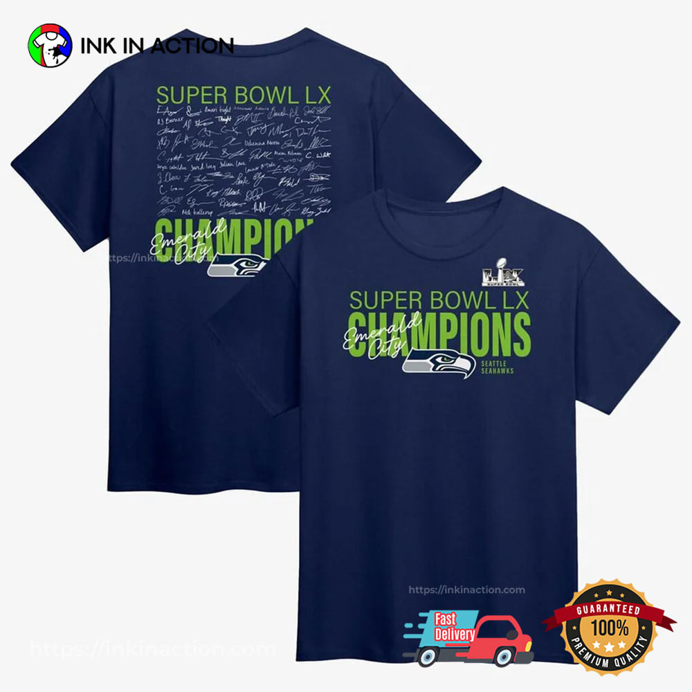 Our Seattle Seahawks Super Bowl LX Champions Signatures 2 Sided Shirt are perfect for those who want to show off their love for their favorite sport or team while staying comfortable and stylish.