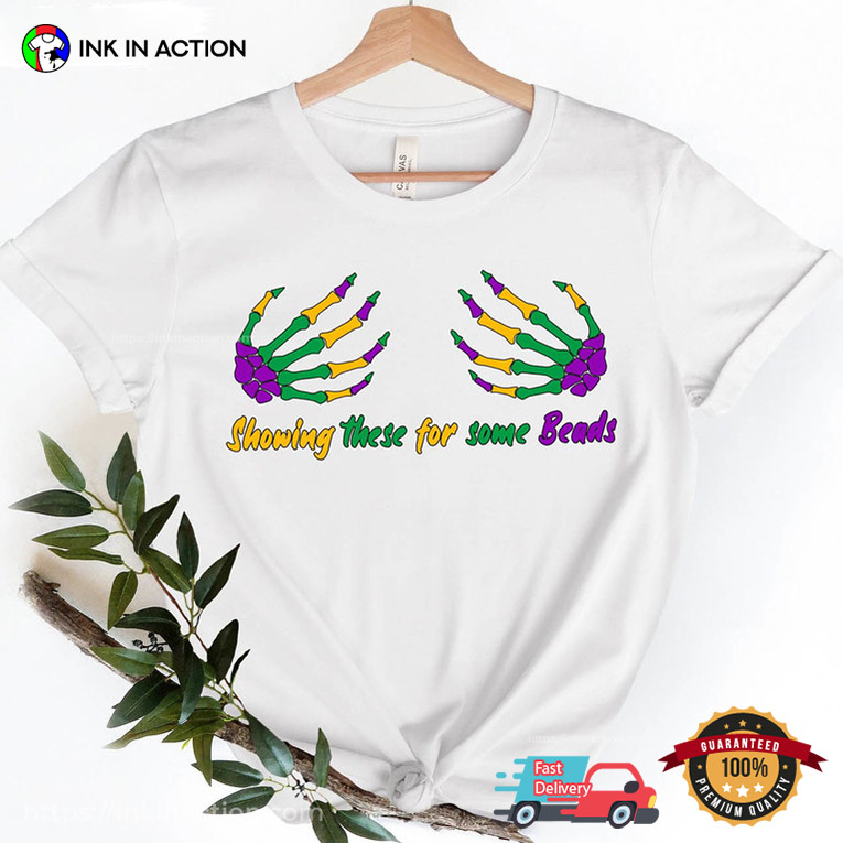 Are you ready to celebrate the holiday season with style and ease? Look no further! Our Showing These For Some Beads Funny Mardi Gras Shirt, printed right here in the USA, offers affordable and practical options that will make your life stress-free and your celebrations unforgettable.