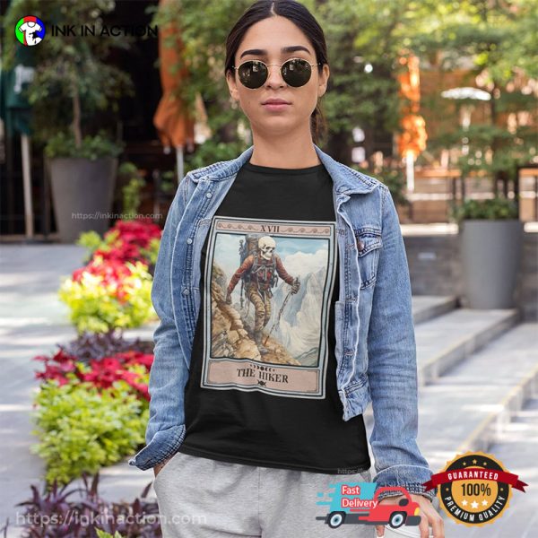 With Ink In Action’s trending shirt designs, you may go out with your pals in style. Have you ever been giddy about great trending t-shirts? Want something that will keep you consistently warm on those long, chilly nights? So stop looking now! You own this Skeleton The Hiker Tarot Card T-shirt.