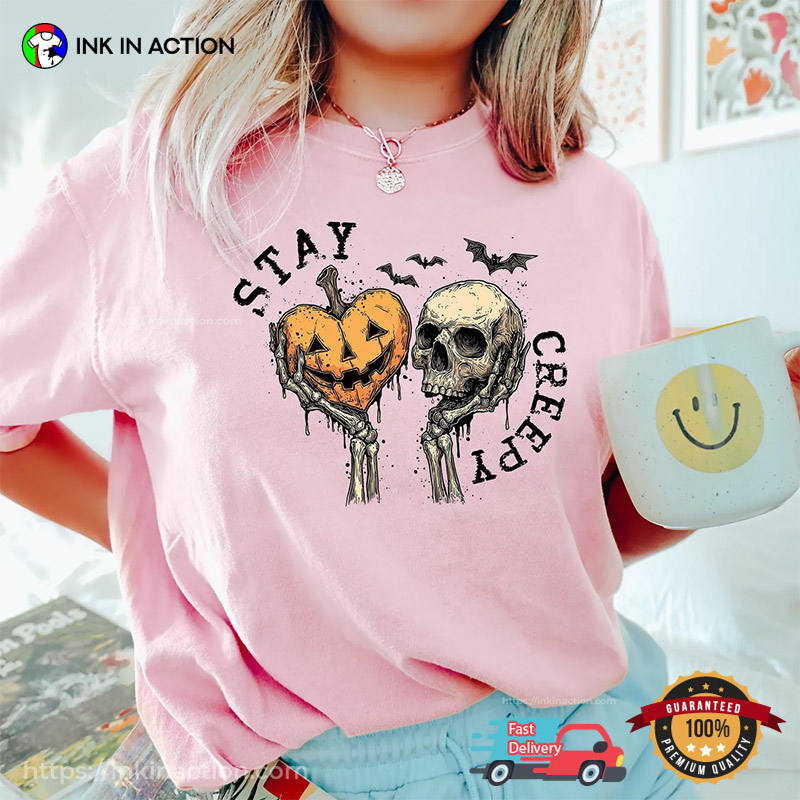 Stay Creepy Halloween Skull And Pumpkin Comfort Colors T-shirt: Cozy chills, haunting thrills.