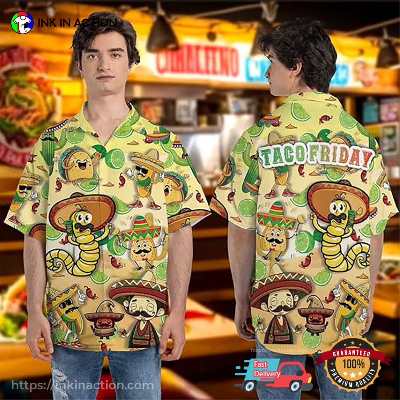 Bring the Aloha Spirit everywhere you go with Ink In Action’s Taco Friday Cinco De Mayo Worm Aloha Shirt!