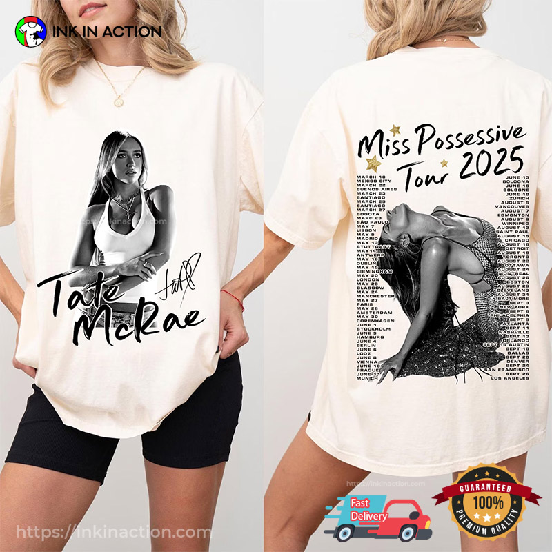 Rock your style with the Tate McRae Miss Possessive 2025 Tour Schedule T-shirt, the ultimate merch for fans of the rising pop sensation! Featuring exclusive graphics from her 2025 World Tour, this shirt captures Tate’s bold energy and unforgettable performances. Made from soft, high-quality cotton, it’s perfect for concerts, casual wear, or showing your fandom anywhere. Available in multiple sizes and colors, it’s a must-have for every Tate McRae fan. Get your Tate McRae World Tour T-shirt today and wear the music you love! 🎤✨