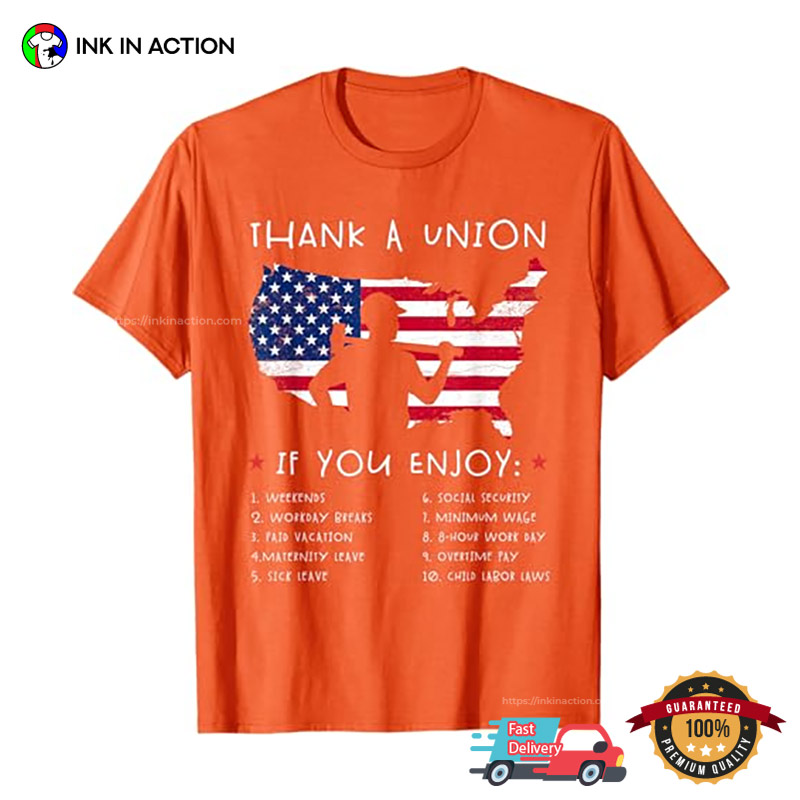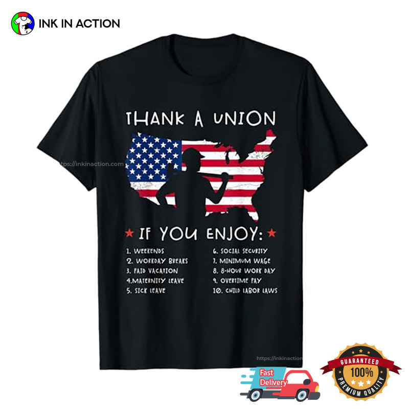 Are you ready to celebrate the holiday season with style and ease? Look no further! Our Thank A Union If You Enjoy Labor Day Activities T-shirt, printed right here in the USA, offers affordable and practical options that will make your life stress-free and your celebrations unforgettable.