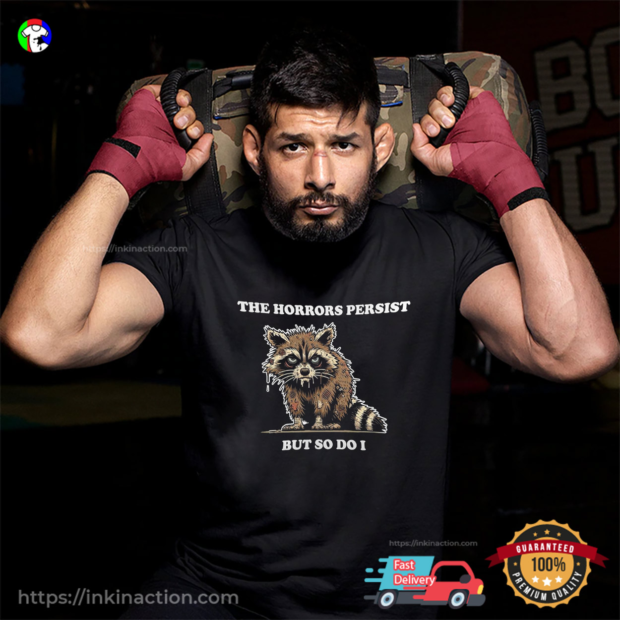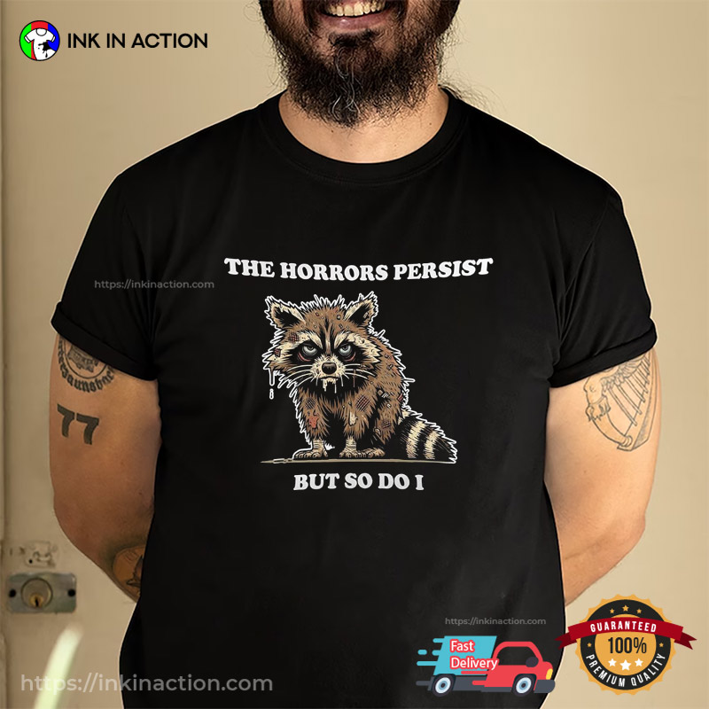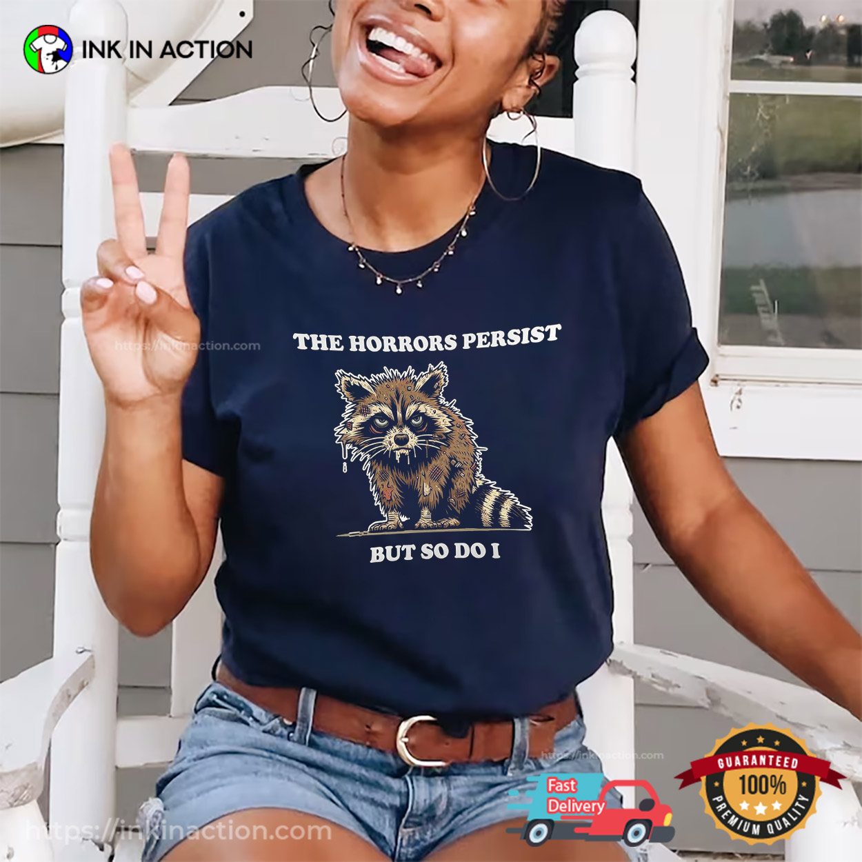 The Horrors Persist But So Do I Funny Meme Raccoon T-shirt
