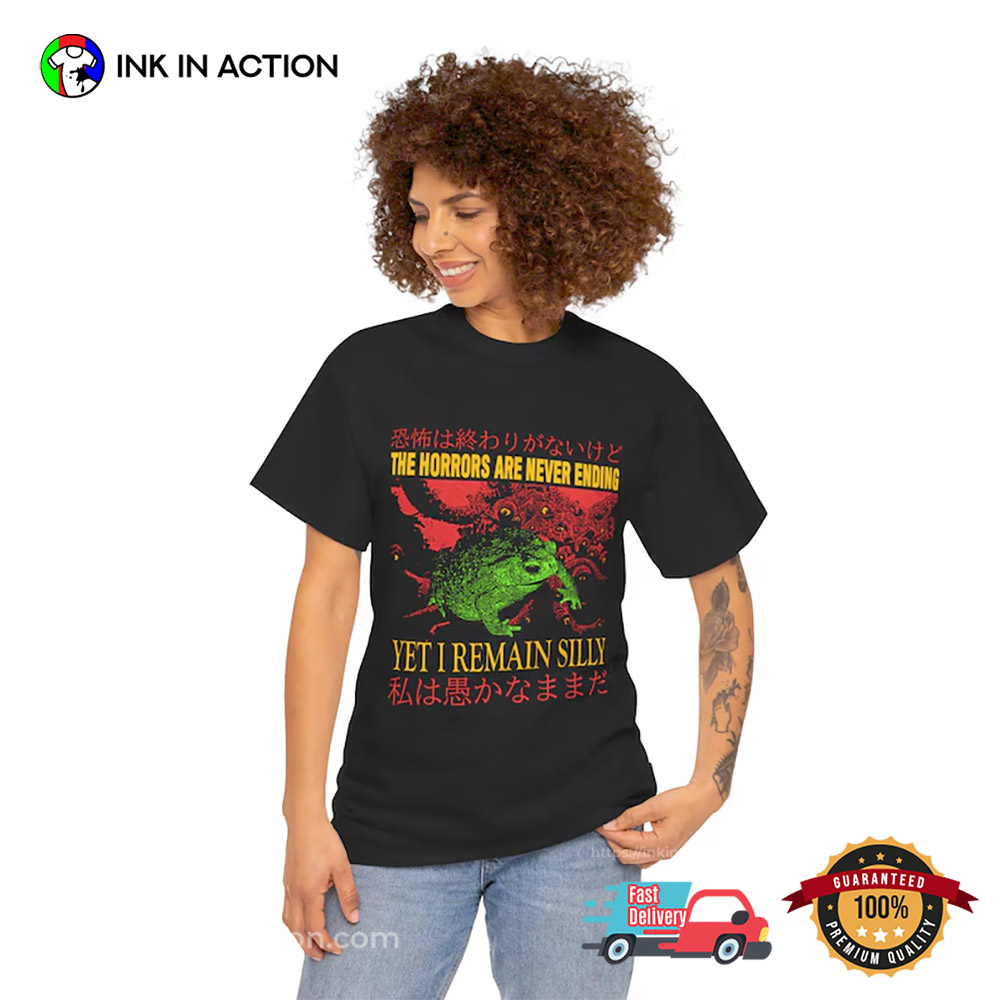 In the ever-evolving fashion world, staying on trend is not just a choice; it’s a statement. Our The Horrors Vintage Japanese Frog T-Shirt are more than garments; they are canvases of self-expression, reflecting the spirit of the times. We understand that fashion is a language, and our trending shirts speak volumes.