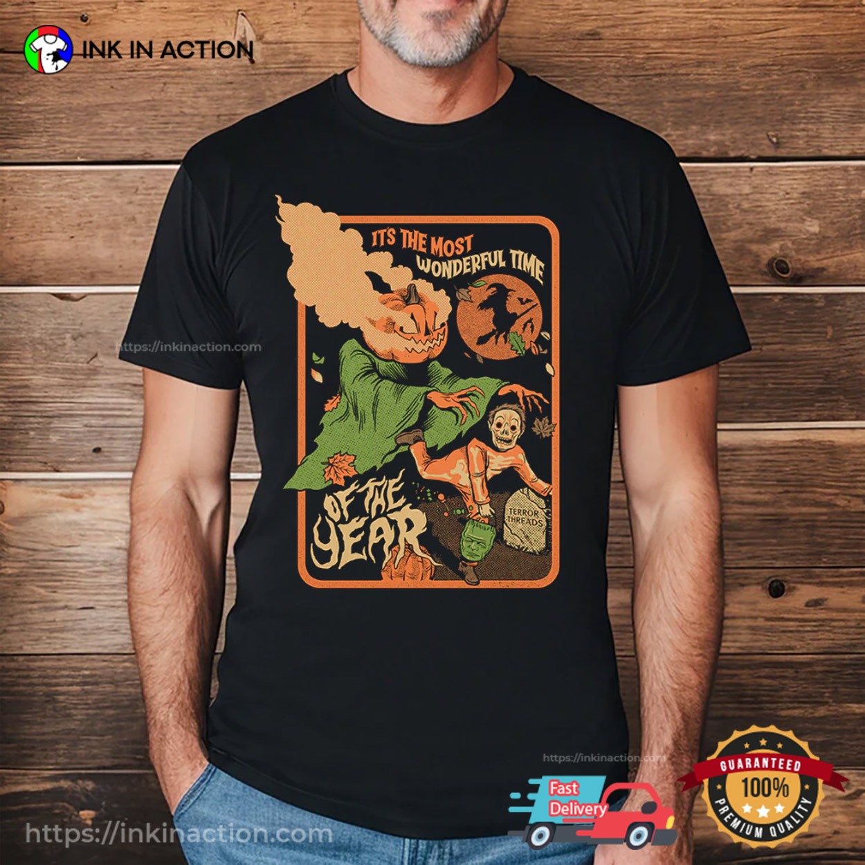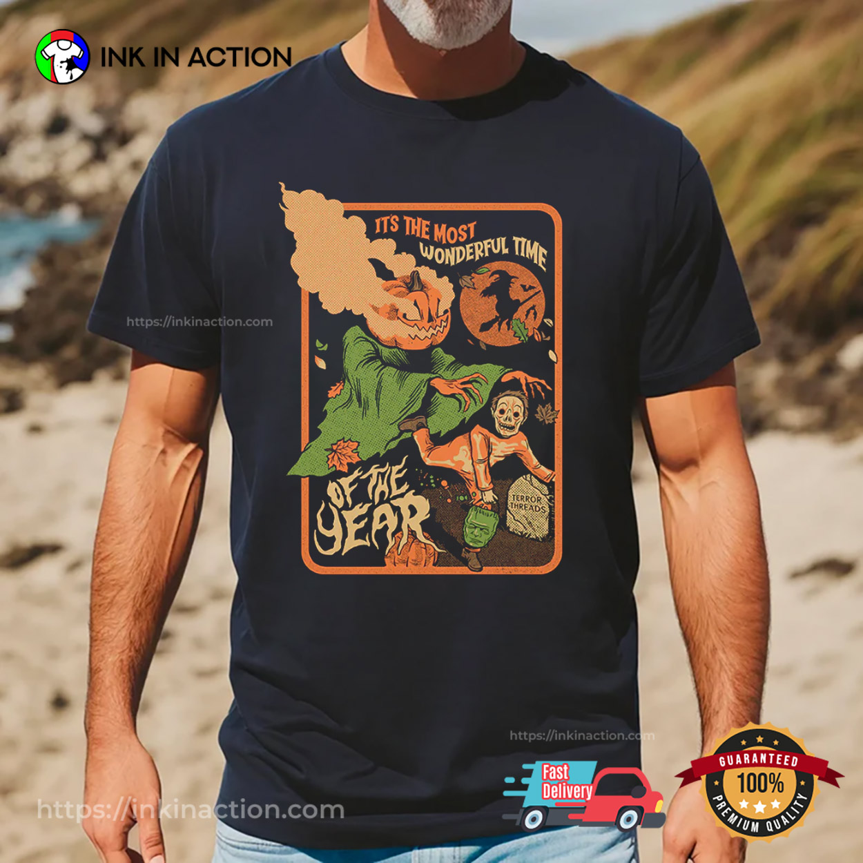 Looking for something with a vintage vibe? Explore our collection of vintage Halloween shirts, featuring classic designs and retro-inspired graphics. From black cats to haunted houses, our vintage shirts capture the nostalgic charm of Halloween past, making them a timeless addition to your wardrobe.