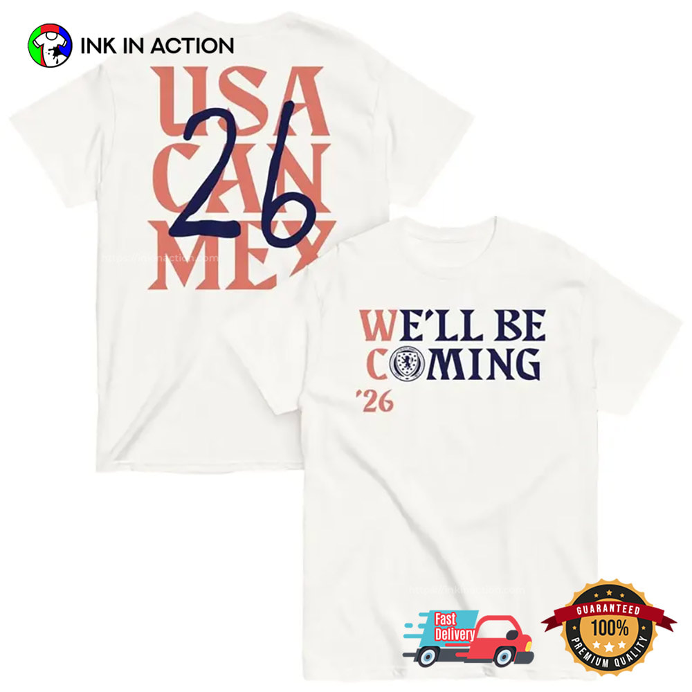 Cheer on your nation with pride in the We’ll Be Coming USA Can Mex 26 2 Sided Shirt, designed for fans gearing up for an exciting World Cup journey. Made from soft, breathable fabric, this stylish tee features bold Scotland-themed graphics, national colors, and football-inspired details that show your support loud and clear.