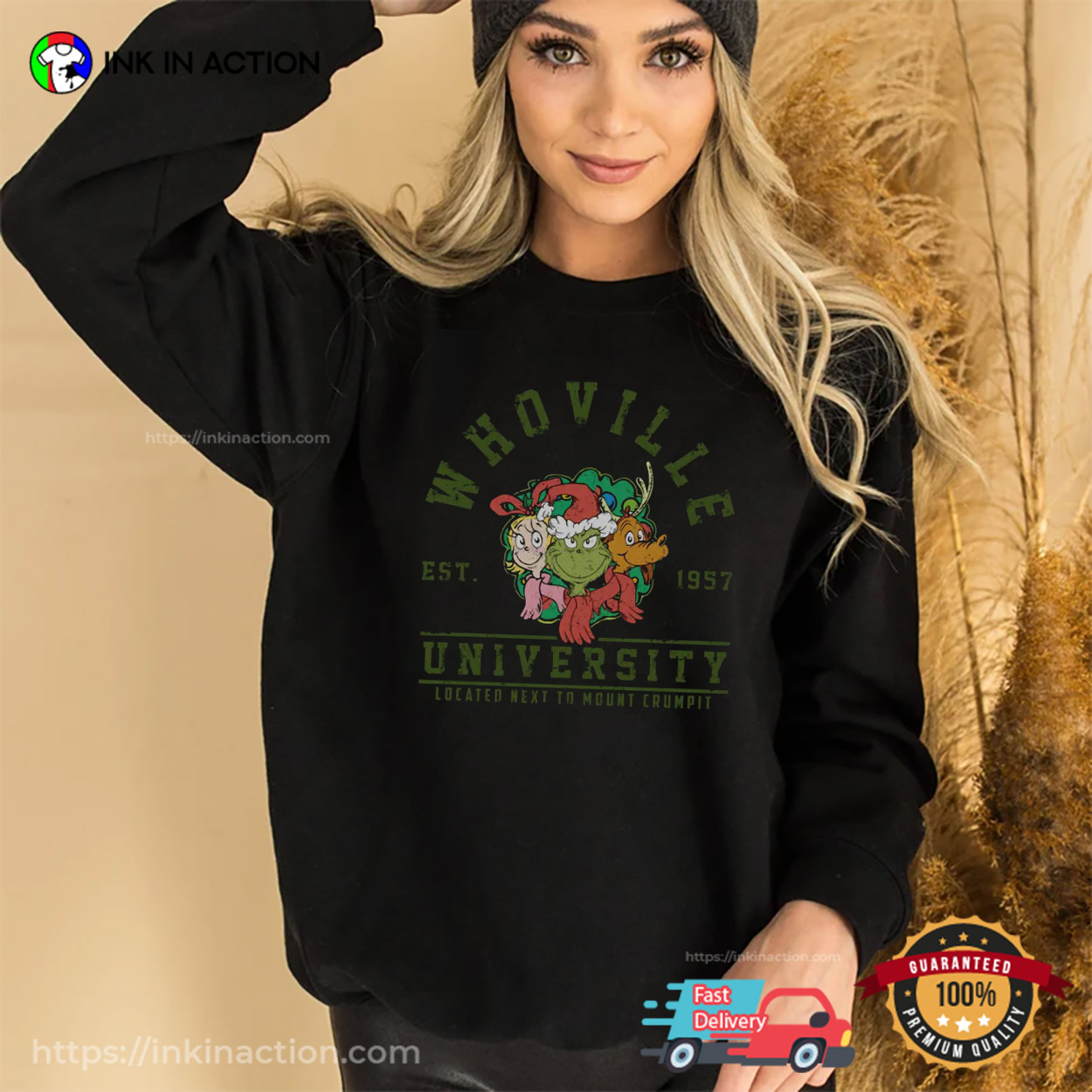 Bring playful mischief to the holidays with this Whoville University Classic Grinch Christmas Shirts, perfect for fans who love a little sass with their seasonal cheer. Made from soft, breathable cotton, it keeps you comfy through every party, movie night, or cozy winter day. Ideal for gifting or casual wear—celebrate Christmas with Grinchy style and a smile.