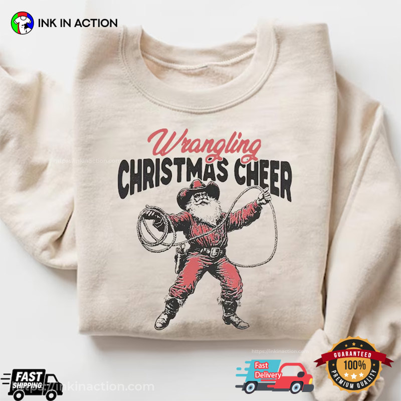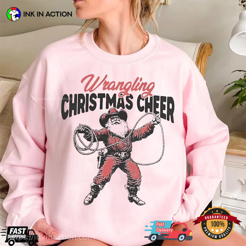 Wrangling Christmas Cheer Cowboy Santa Funny Shirt